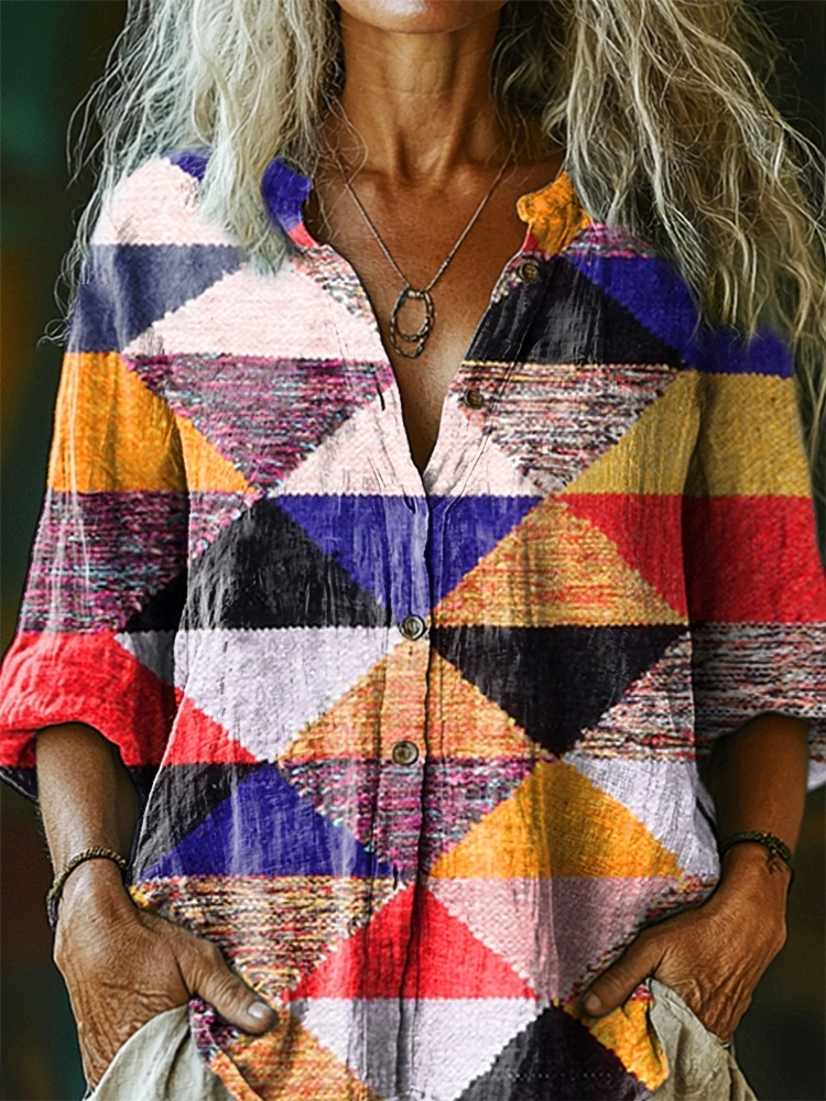 Women's Colorful Triangle Pattern Art Print Casual Cotton Linen Shirt