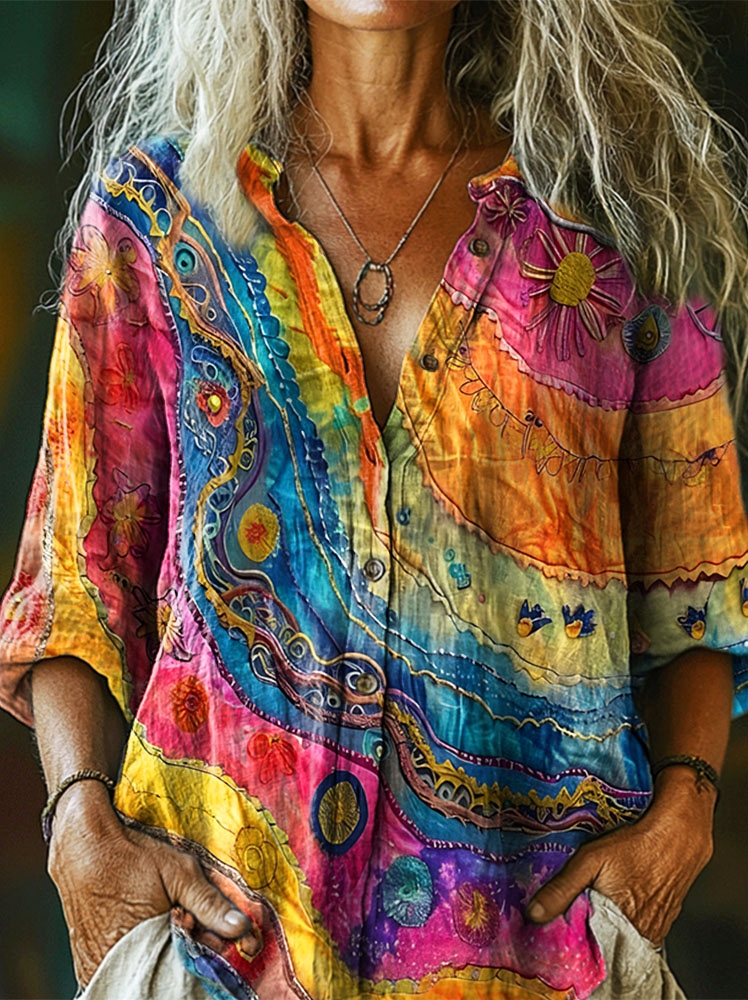 Women's Colorful Wave Texture Art Print Casual Cotton Linen Shirt