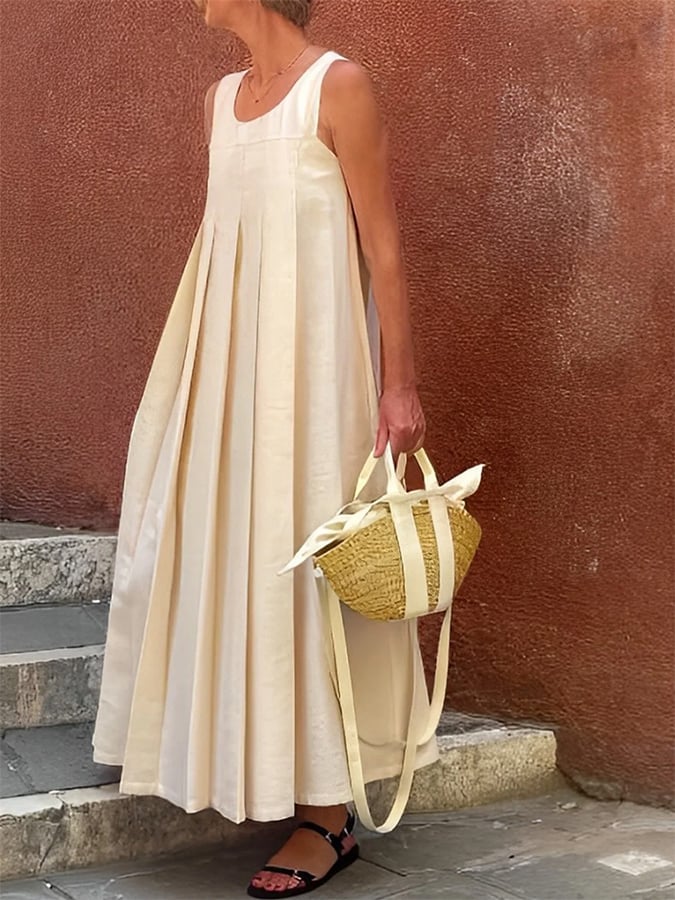 Women's Cotton And Linen Pleated Stitching Design Solid Color Large Skirt Dress