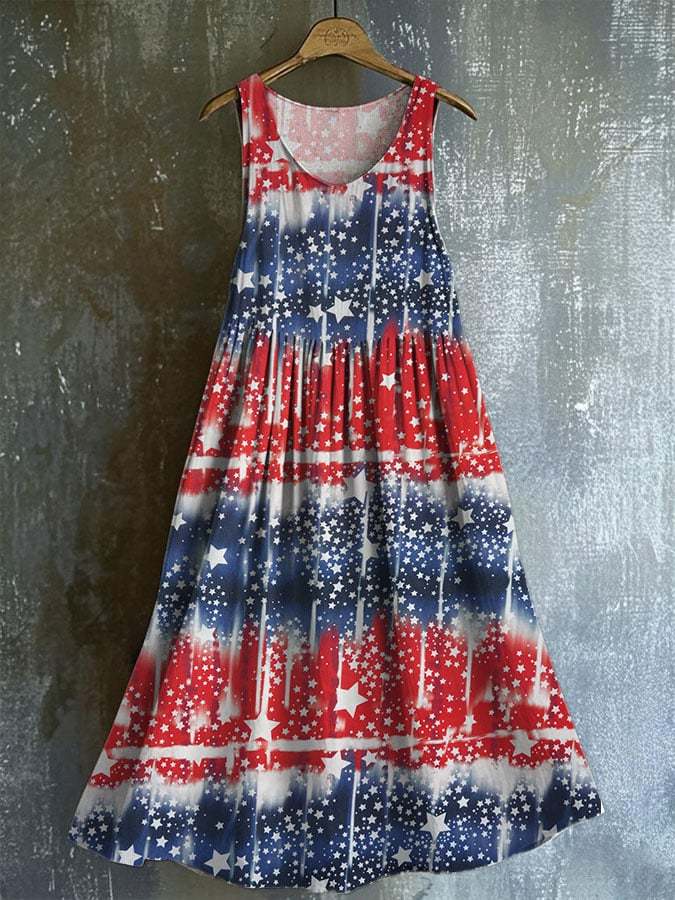 Women's cotton and linen retro Independence Day tie-dye star art print suspender dress