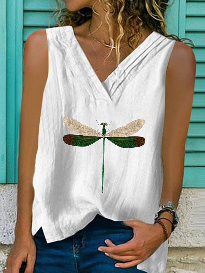 Women's Cotton Linen Fashion Casual V-neck Dragonfly Print Vest