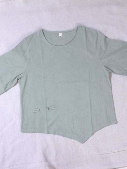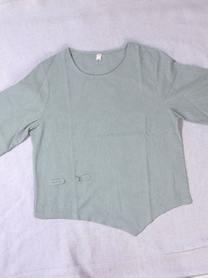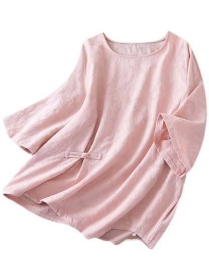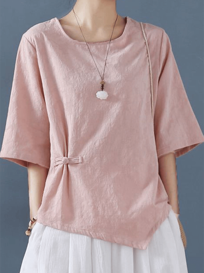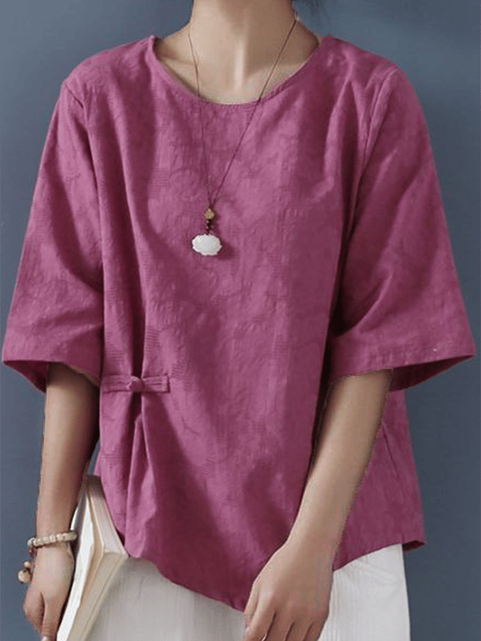 Women's Cotton Vintage Jacquard Frog Button Half Sleeve Casual Round Neck Shirt