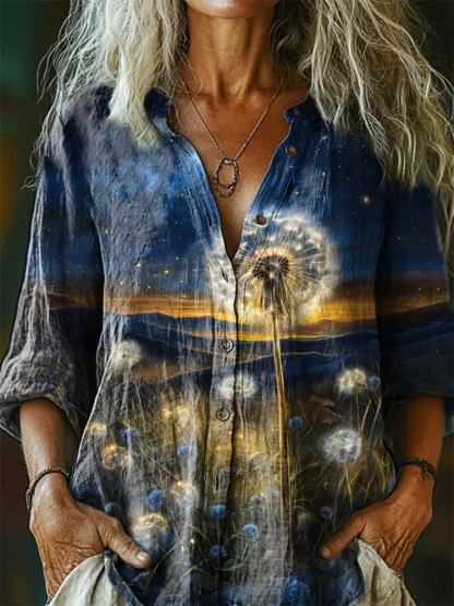 Women's Dandelion Pattern Art Print Casual Cotton Linen Shirt