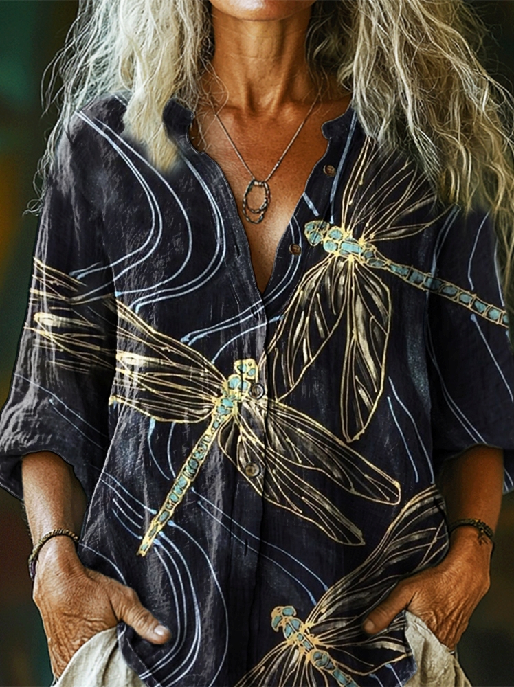 Women's Dragonfly Art Pattern Print Casual Cotton Linen Shirt