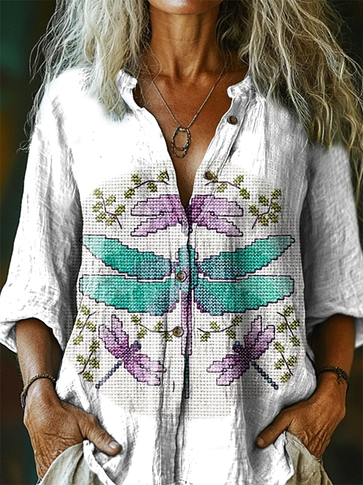 Women's Dragonfly Pattern Art Print Linen Cotton Casual Shirt