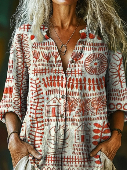 Women's Ethnic Art Print Casual Cotton and Linen 3/4 Sleeve Shirt