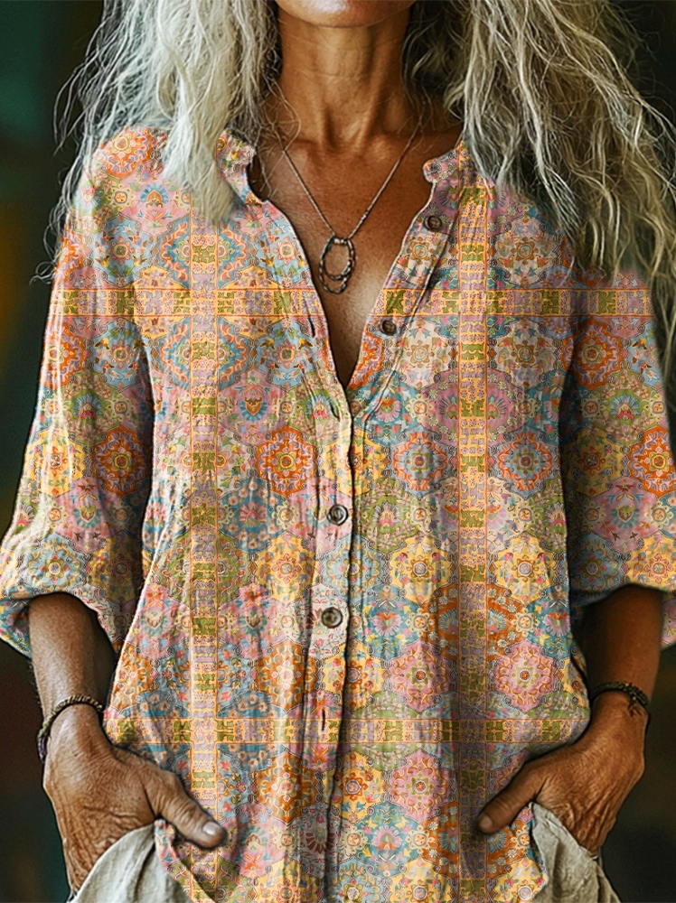 Women's Ethnic Floral Art Patterns Print Linen And Cotton V-neck Casual Shirt