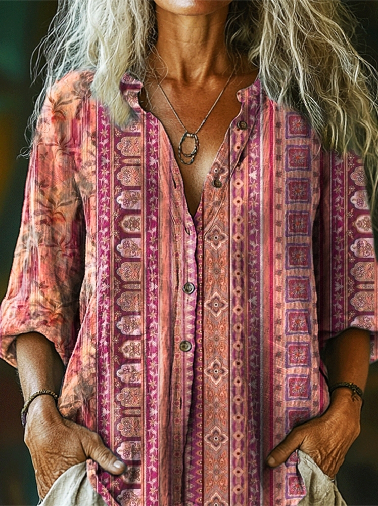 Women's Ethnic Floral Collage Art Print Casual Cotton Linen Shirt