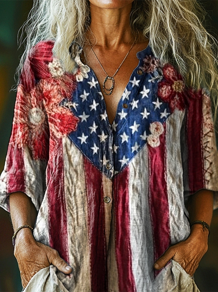 Women's Ethnic Floral Collage Flag Art Print Casual Cotton Linen Shirt