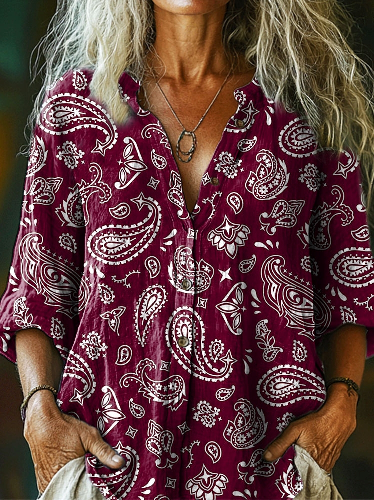 Women's Ethnic Paisley Art Print Casual Cotton and Linen Shirt