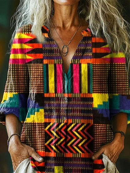 Women's Ethnic Totem Art Print Casual Cotton and Linen 3/4 Sleeve Shirt