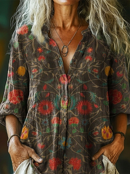Women's Ethnic Totem Floral Art Pattern Print Casual Cotton Linen Shirt
