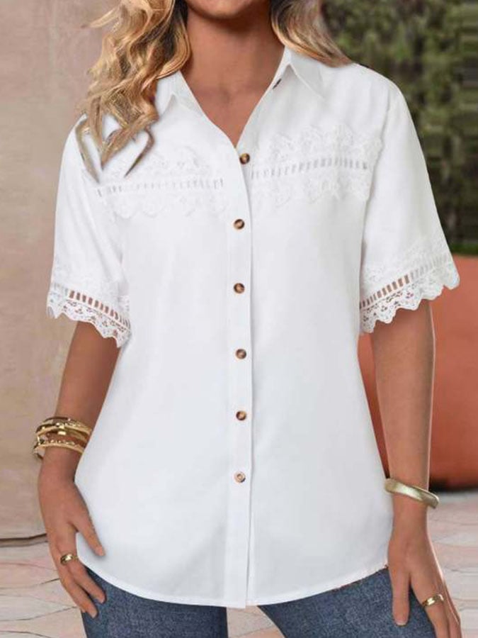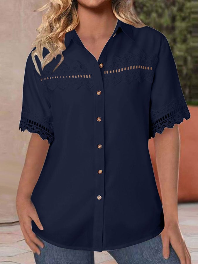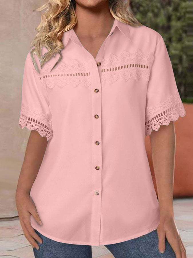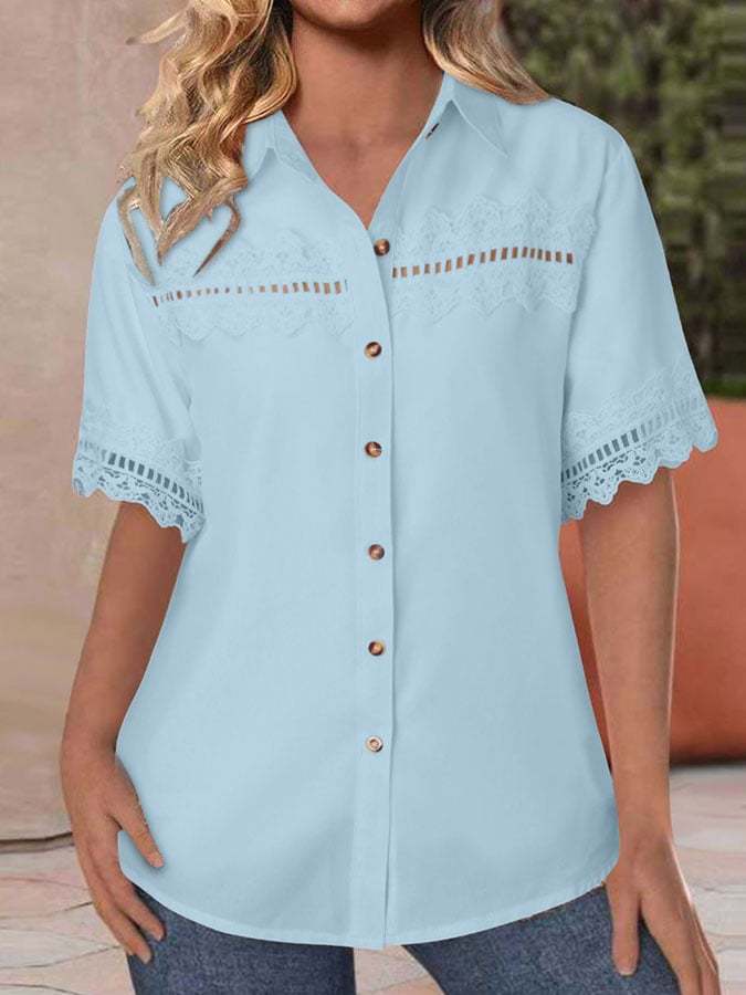 Women'S European And American V-Neck Button-Stitched Lace Short-Sleeved Casual Shirt