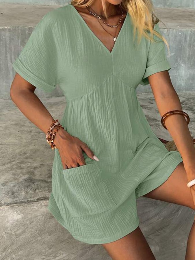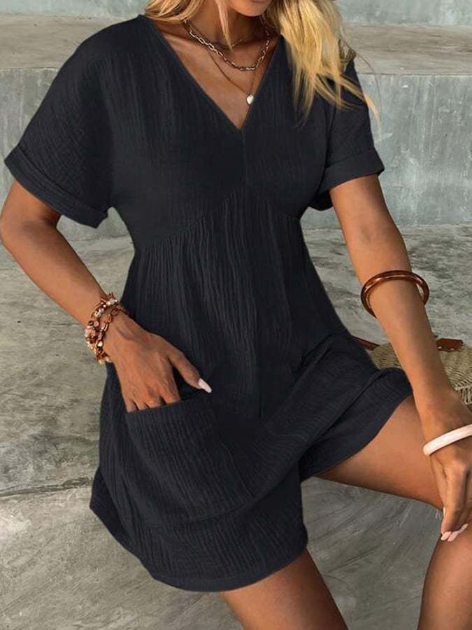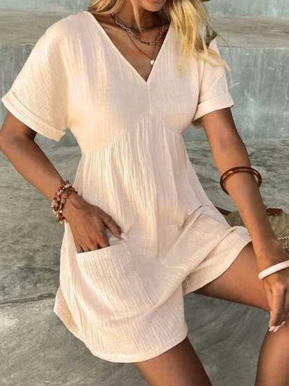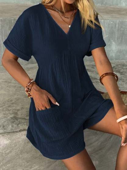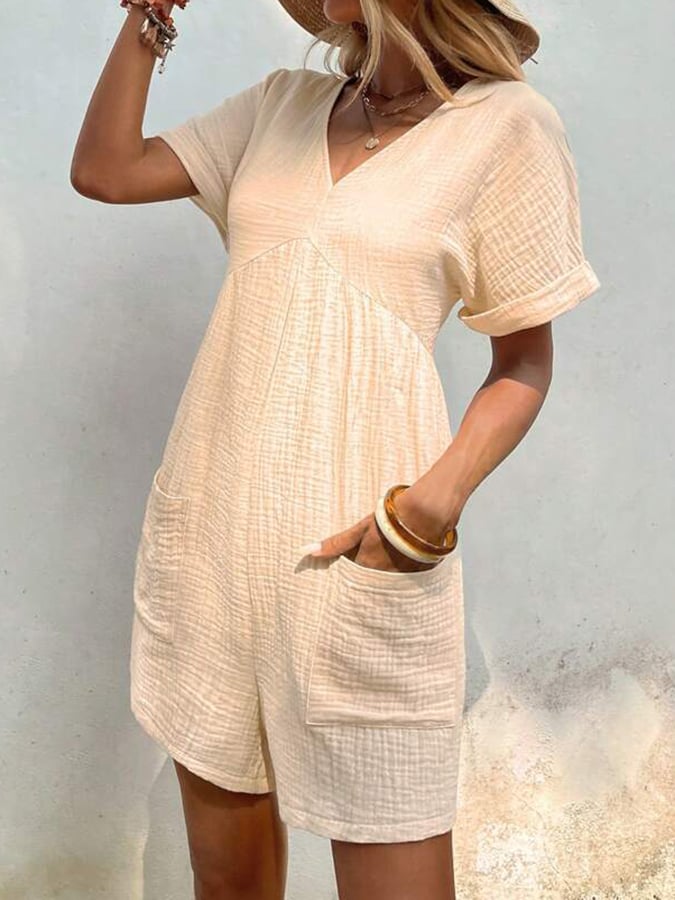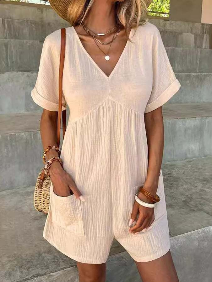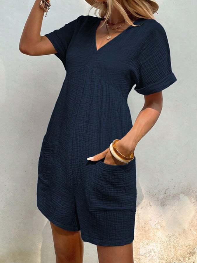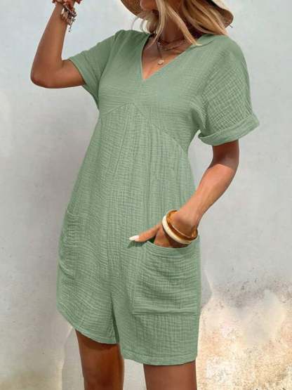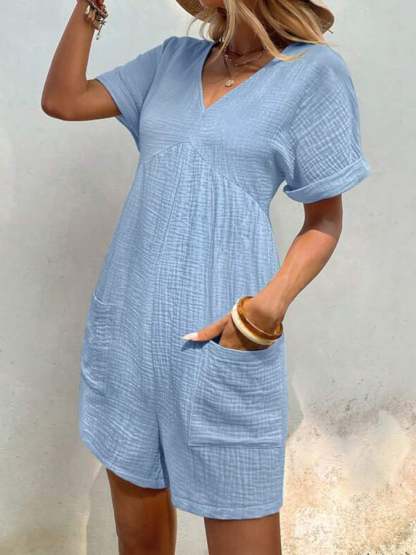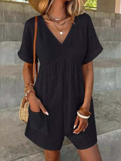 Women's Fashion Solid Color V Neck Loose Bat Sleeve Pocket Zipper Short Sleeve Jumpsuit