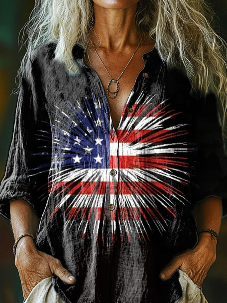 Women's Flag Firework Pattern Art Print Casual Cotton Linen Shirt