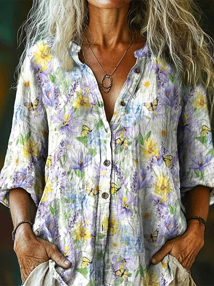 Women's Floral Art Print Casual Cotton and Linen Shirt