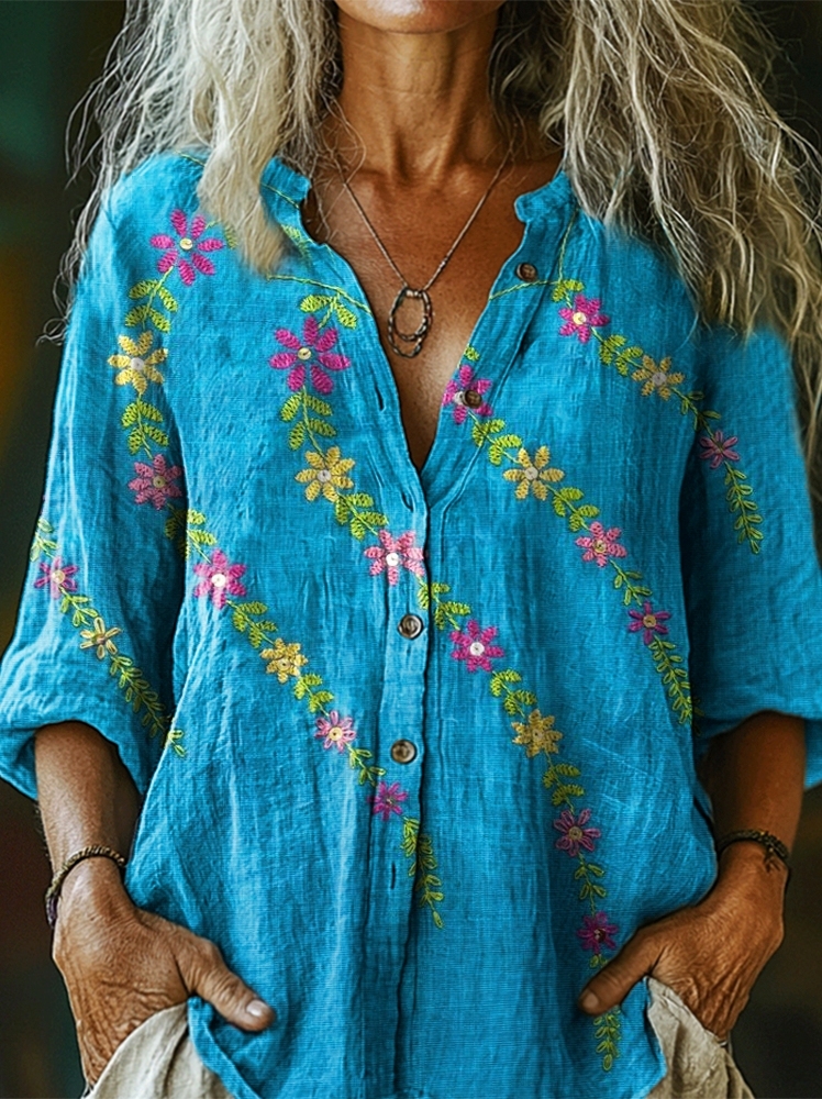 Women's Floral Art Print Casual Cotton Linen Shirt