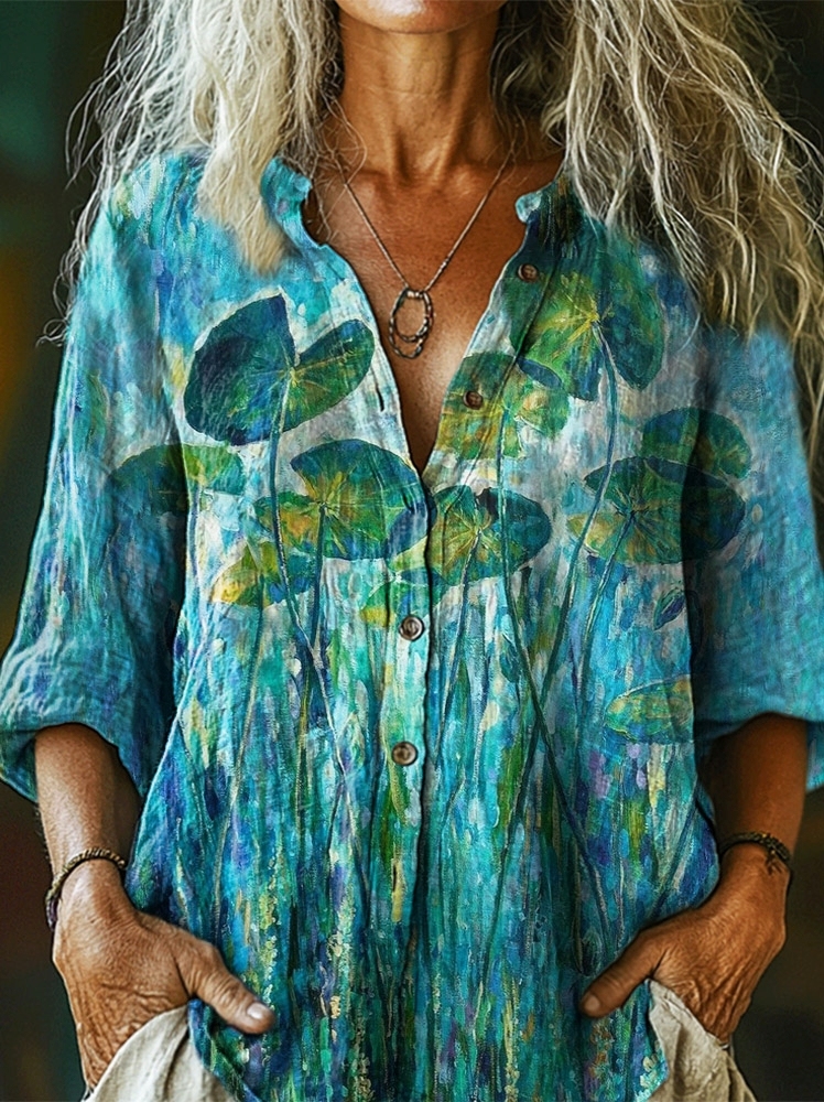 Women's Floral Art Print Casual Cotton Pocket Shirt