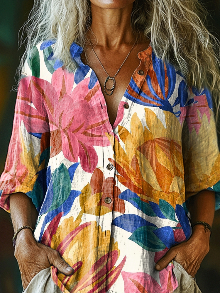 Women's Floral Art Print Casual Cotton Pocket Shirt