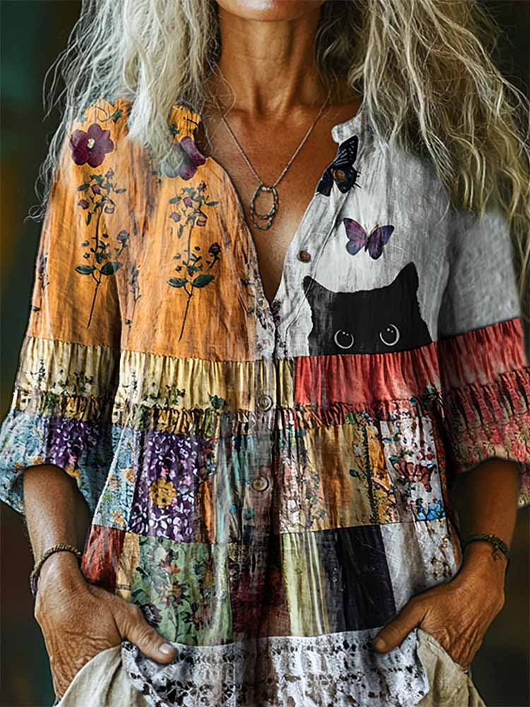 Women's Floral Cat Pattern Art Print Casual Cotton Linen Shirt