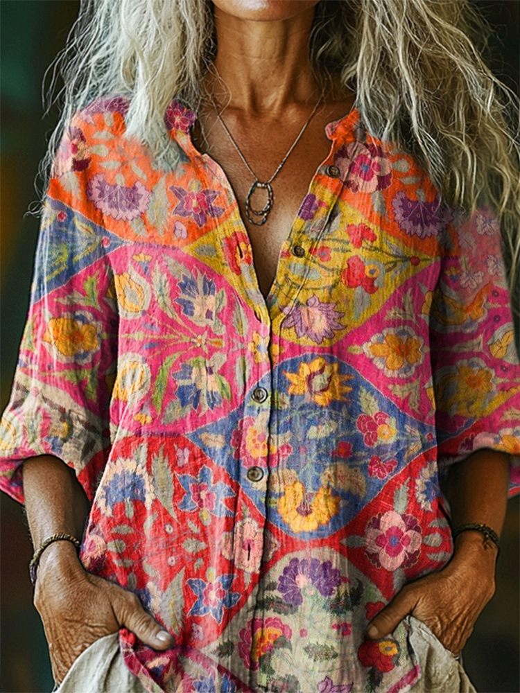 Women's Floral Embellished Pattern Art Print Casual Cotton Pocket Shirt
