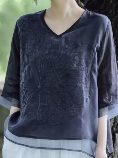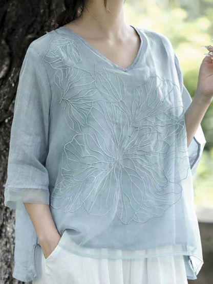 Women's Floral Embroidery Linen Blend V-Neck Shirt