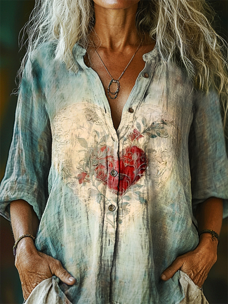 Women's Floral Heart Pattern Art Print Casual Cotton Linen Shirt