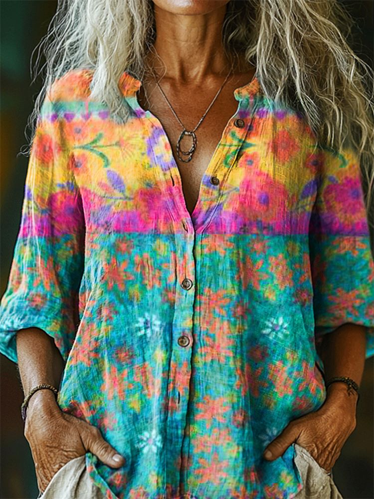 Women's Floral Patchwork Pattern Art Print Casual Cotton Linen Shirt