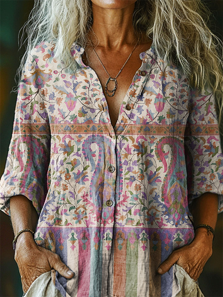 Women's Floral Pattern Art Print Casual Cotton Linen Shirt