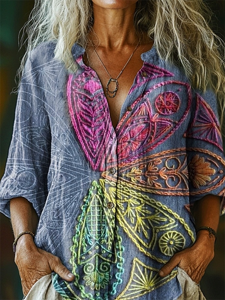 Women's Floral Pattern Art Print Casual Cotton Linen Shirt