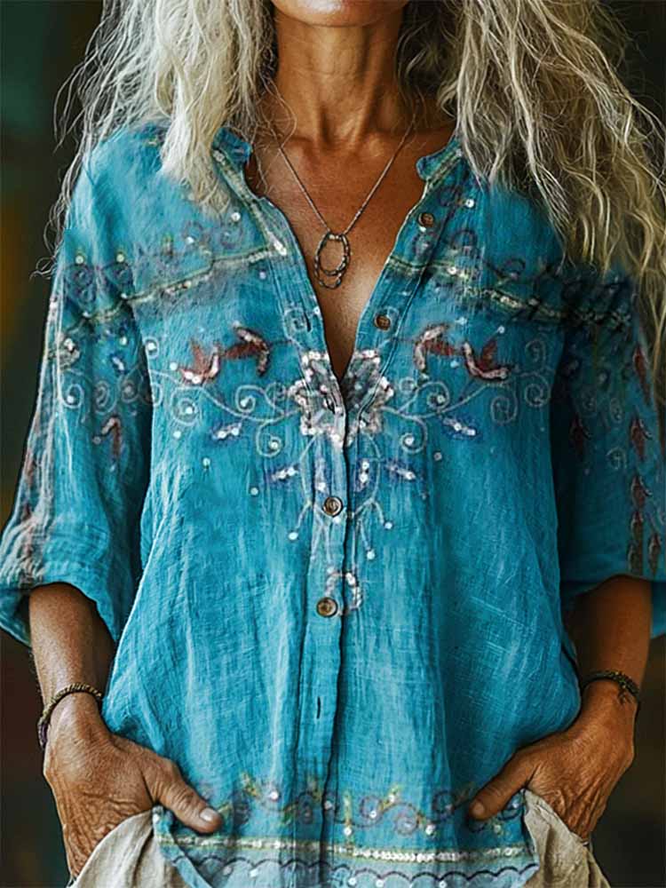 Women's Floral Pattern Art Print Casual Cotton Linen Shirt