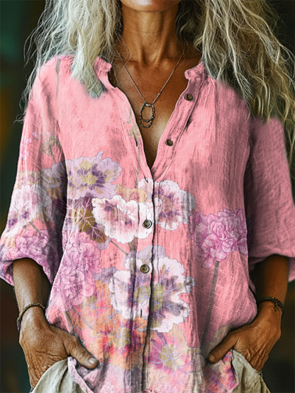 Women's Floral Pattern Art Print Casual Cotton Linen Shirt