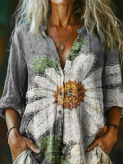 Women's Floral Pattern Art Print Casual Cotton Linen Shirt