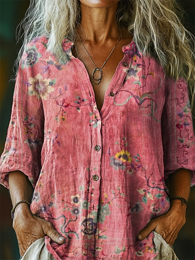 Women's Floral Pattern Art Print Casual Cotton Linen Shirt