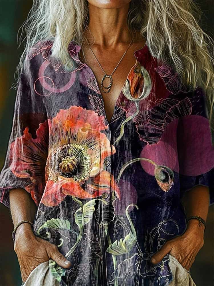 Women's Floral Pattern Art Print Casual Cotton Linen Shirt