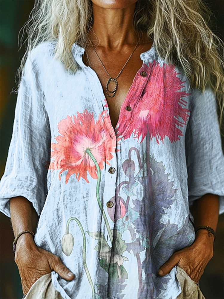 Women's Floral Pattern Art Print Casual Cotton Linen Shirt