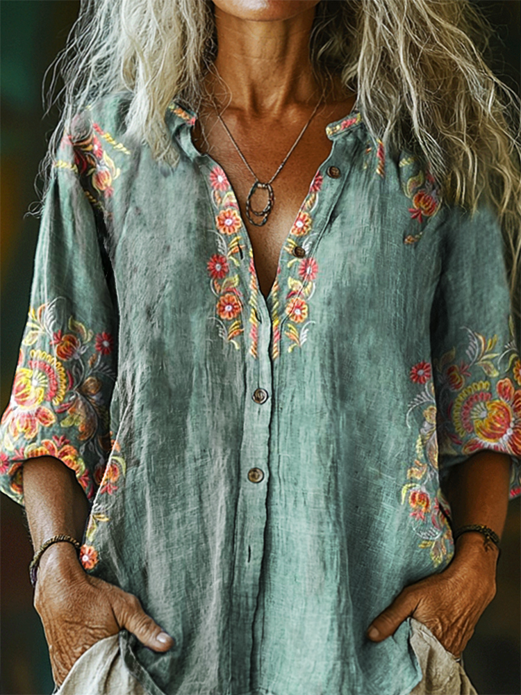 Women's Floral Pattern Art Print Casual Cotton Linen Shirt