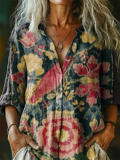 Women's Floral Pattern Art Print Casual Cotton Linen Shirt