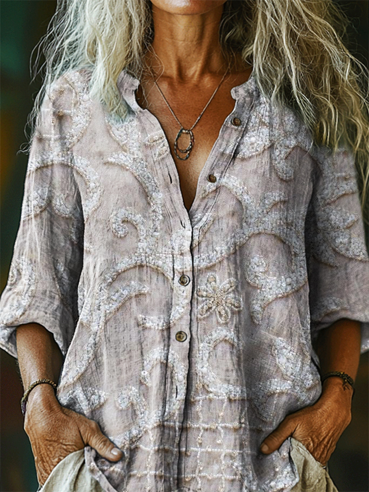 Women's Floral Pattern Art Print Casual Cotton Linen Shirt