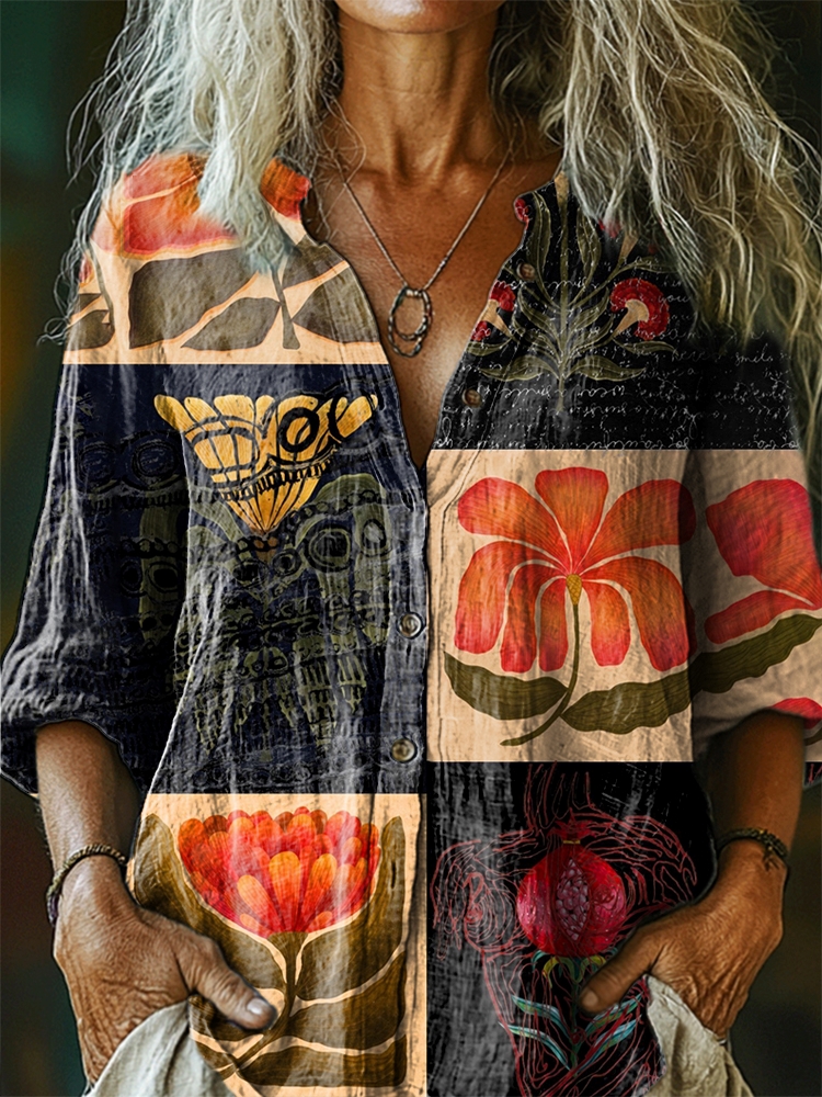 Women's Floral Pattern Art Print Casual Cotton Linen Shirt
