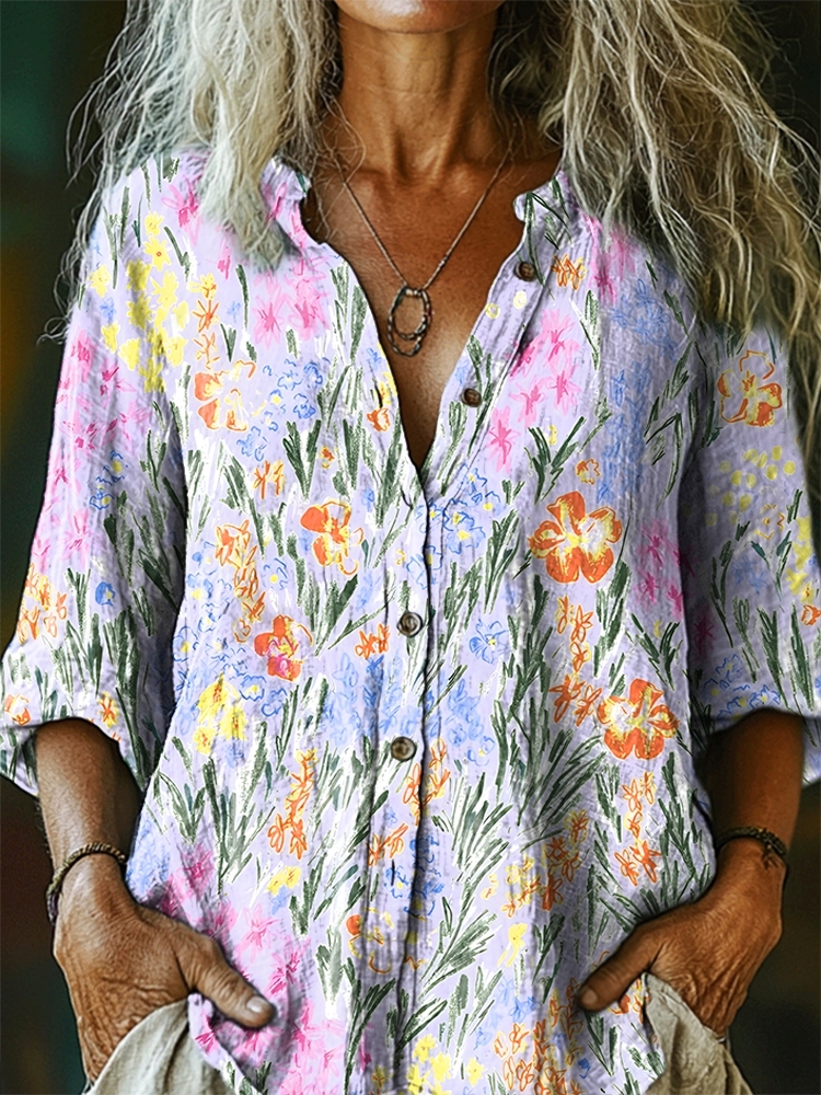 Women's Floral Pattern Art Print Casual Cotton Linen Shirt