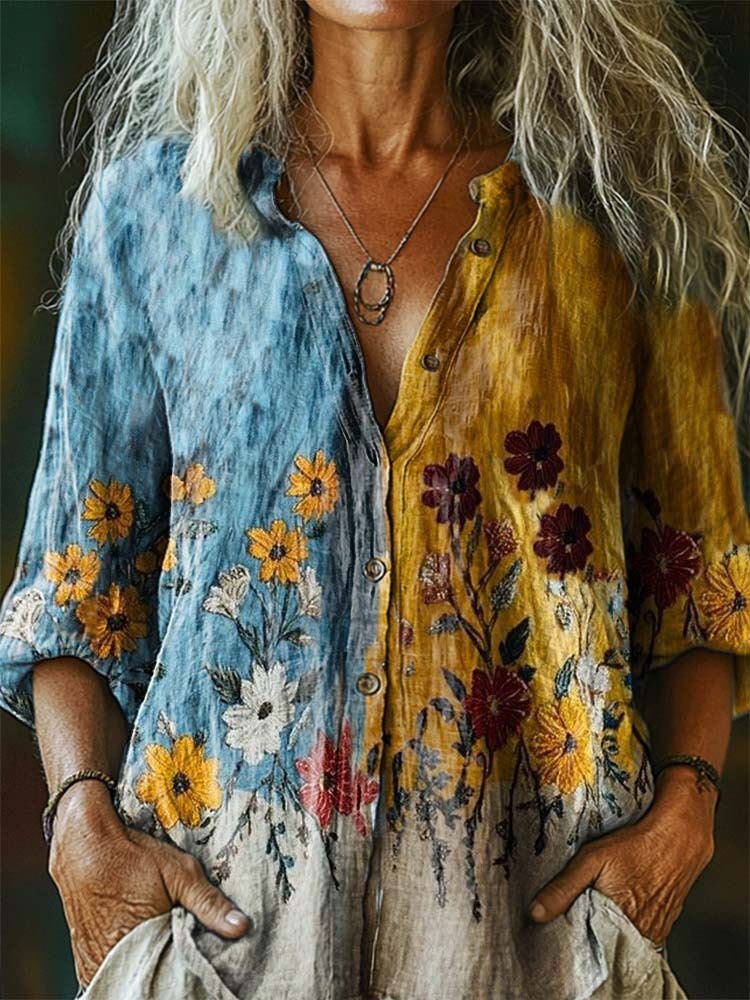 Women's Floral Pattern Art Print Casual Cotton Linen Shirt