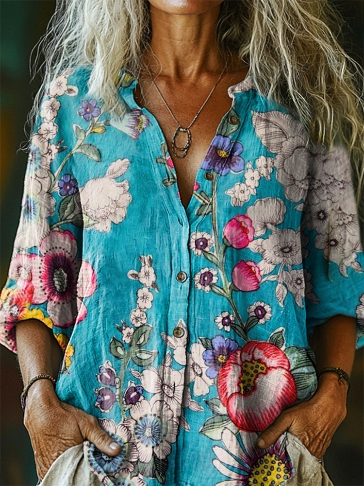 Women's Floral Pattern Art Print Casual Cotton Linen Shirt