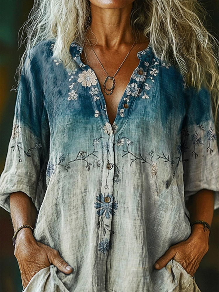 Women's Floral Pattern Art Print Casual Cotton Linen Shirt