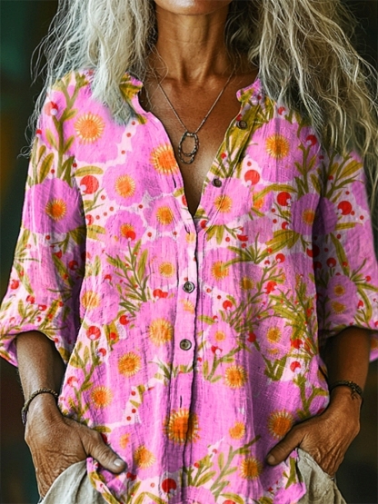 Women's Floral Pattern Art Print Casual Cotton Linen Shirt
