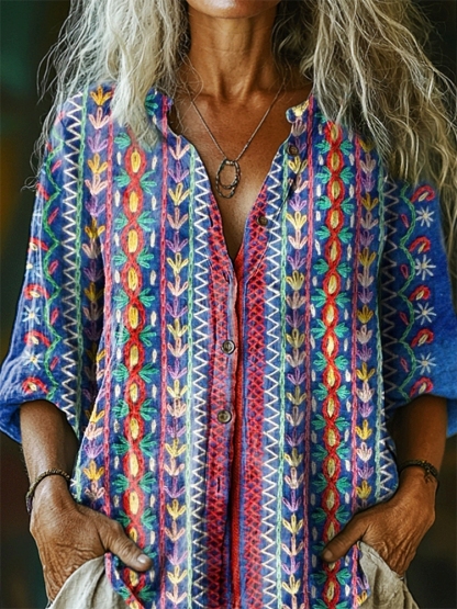 Women's Floral Pattern Art Print Casual Cotton Linen Shirt