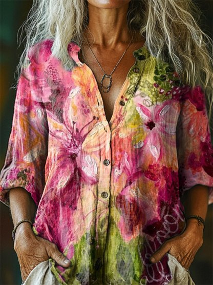 Women's Floral Pattern Art Print Casual Cotton Linen Shirt