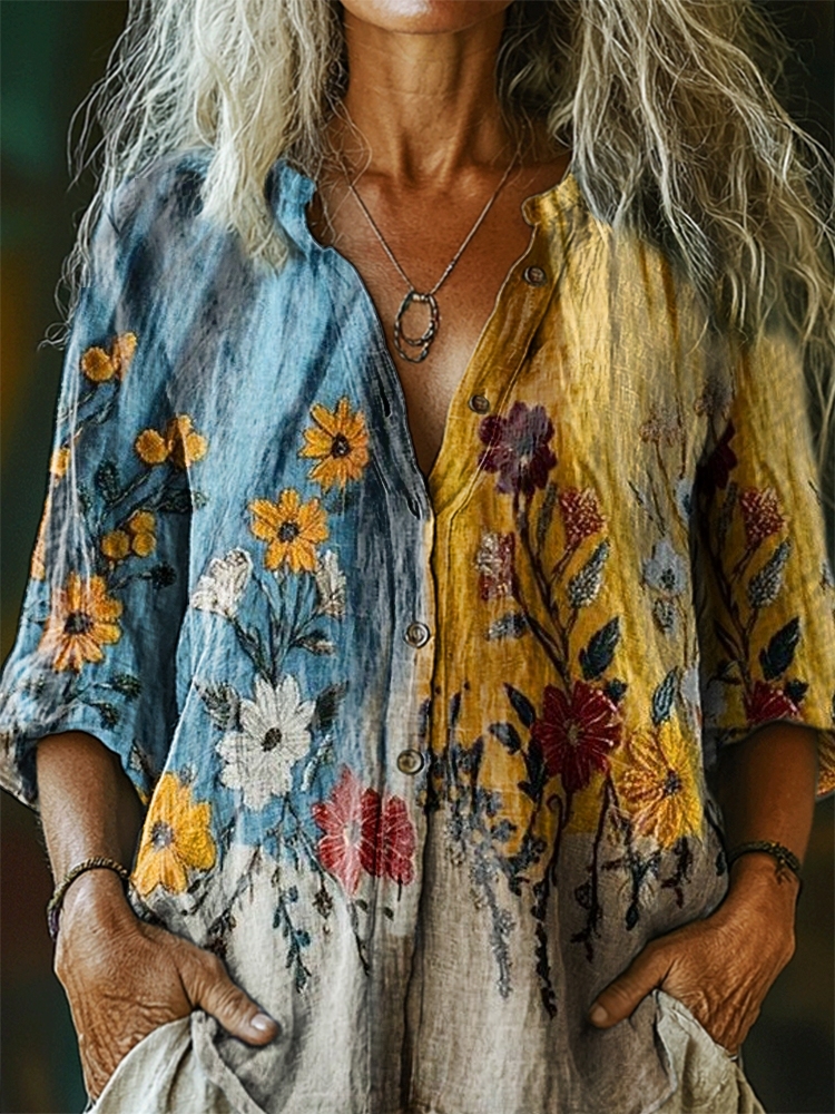 Women's Floral Pattern Art Print Casual Cotton Linen Shirt