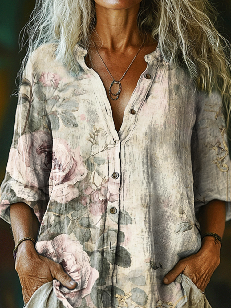 Women's Floral Pattern Art Print Casual Cotton Linen Shirt