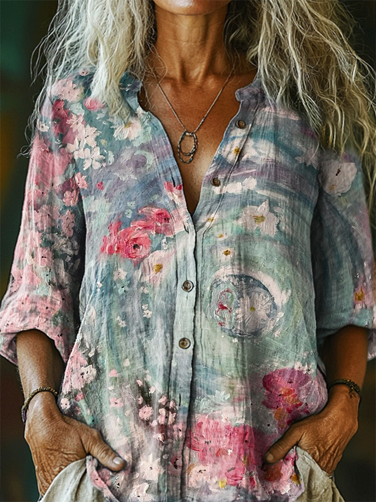 Women's Floral Pattern Art Print Casual Cotton Linen Shirt